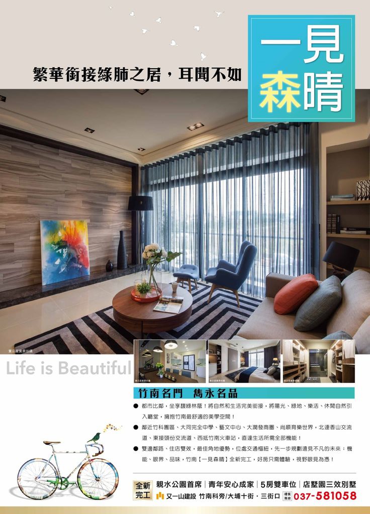 又一山建設「一見森晴」透天案座落竹南鎮大埔三街與大埔十街口角地。基地面積約792坪,土地使用分區為住宅用地,2015年5月完工,總銷約4億。規劃地上4.5-5.5層、無開挖地下室,總戶數30戶(住16、店14),1樓停車2車位之連棟式透天社區。建坪方面,住約65-66坪,店約65-103坪;地坪方面,住約26-27坪,店約23-39坪。5-12格局,面寬約5.2米,可做出租店面+套房使用,具投資價值。建議售價每戶約1188萬起。自備20%起。接待中心:基地上。聯絡電話:037-581058