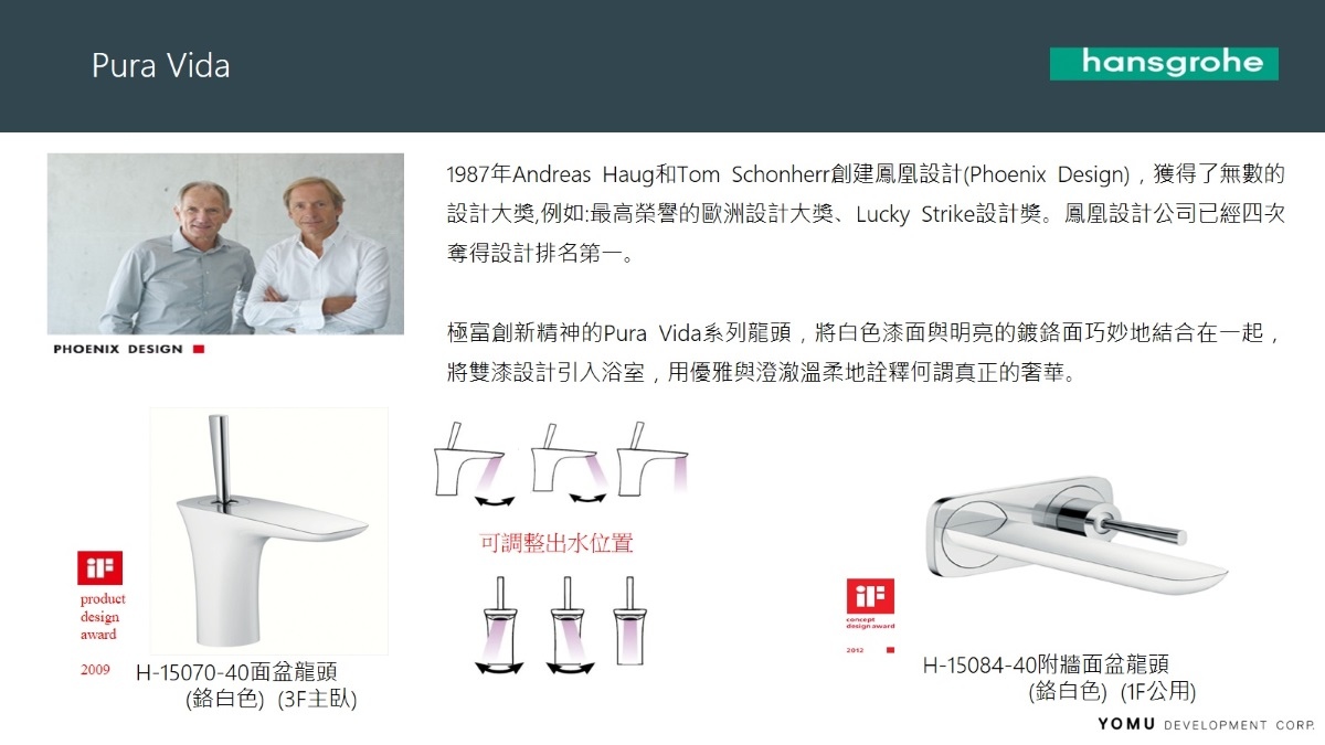 1.品牌形象:百年衛浴設備大廠Hansgrohe在德國擁有高達7成的市佔率,旗下擁有Hansgrohe、Axor及Pharo三大品牌,同時也是世界豪宅及精品旅館的偏好品牌。