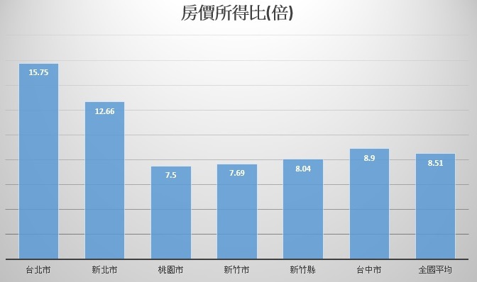 新竹不僅民眾收入高,房價所得比也處於相對低廉水準。根據內政部營建署統計,2015年第4季台北市房價所得比高達15.75倍,等於台北市民不吃不喝近16年才能在台北市買房;新北市為12.66倍,桃園市為7.5倍,全國平均值為8.51倍,而新竹市為7.69倍、新竹縣為8.04倍,雙雙低於全國平均值。