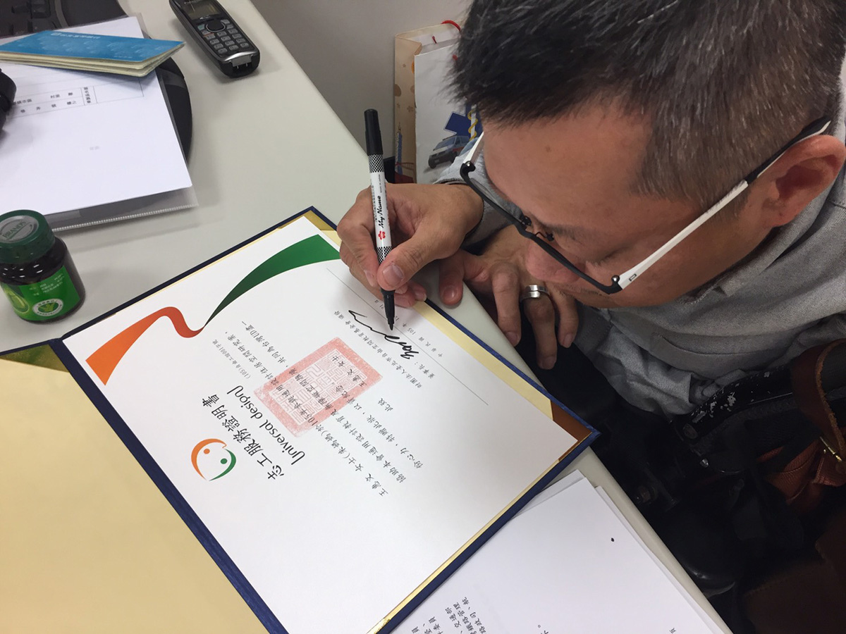 記者會上唐董事長更頒發了首張基金會志工證給此次參與研究今年已76歲的朱媽媽,在與會貴賓的見證下,朱媽媽滿心歡喜的從唐董事長手上接過志工證,唐董事長說,「朱媽媽的雙腳不能久站,所以移動時多半要依靠電動輪椅,在研究計畫前,朱媽媽對通用設計並沒有概念,而是用自己的生活經驗去改善整個住家動線與空間,我們真的很感謝朱媽媽與其他受訪者的熱心參與,讓整個研究計畫順利進行,對於朱媽媽實際以身體力行落實通用設計,基金會很榮幸的邀請朱媽媽擔任我們的終生志工,這張志工證還是天字第一號呢!」朱媽媽笑著說,「我本來已經規畫退休生活要四處參加讀書會,但這次很感謝唐董事長跟基金會同仁的協助,把通用設計導入自己的居家環境中,也確實改善了我的生活品質,我也決定以後要全力協助基金會跟唐董事長來推廣通用設計」。