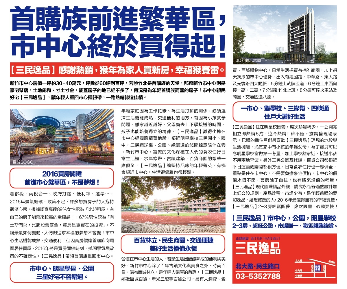 位在新竹市中心的【三民逸品】,開賣以來好評不斷,除了位處市中心精華地段的獨厚優勢,並與周邊綠地公園形成散步生活圈、休憩機能完善,更是吸引購屋族的魅力之一,【三民逸品】為在新竹老城市心,古蹟建築林立、人文氛圍濃厚,又有新光三越及巨城百貨兩大百貨龍頭連線,提供時尚生活品味,湳雅商圈、大潤發及愛買,讓日常採買便利,滿足現代人生活機能需求,走出家門便是三民公園、經國綠園道與中央公園,三重綠帶構成散步生活圈,與綠意為鄰,幸福無價。03-5352788
