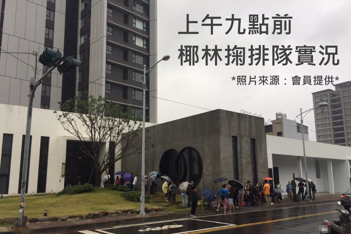 毫無懸念!沒有意外!椰林掬重現竹北預售房市排隊盛況!椰林掬今天上午十點開賣,還沒到九點,接待中心已經大排長龍!椰林掬預售大樓案位於竹北縣治三期重劃區,近安興國小、台元科技園區,竹北交流道以及未來的遠東新世紀購物中心。本案為13F/B2獨棟建築、單層5併大樓產品,總戶數住65+店4=69戶,規劃39.3坪3房(BC戶)、40.5坪3房(A戶)、41.3坪3房(E戶),以及53.6坪4房(D戶)產品。建議售價每坪23.5-24萬。接待中心:竹北自強北路、十興路二段口。聯絡電話:03-6581177