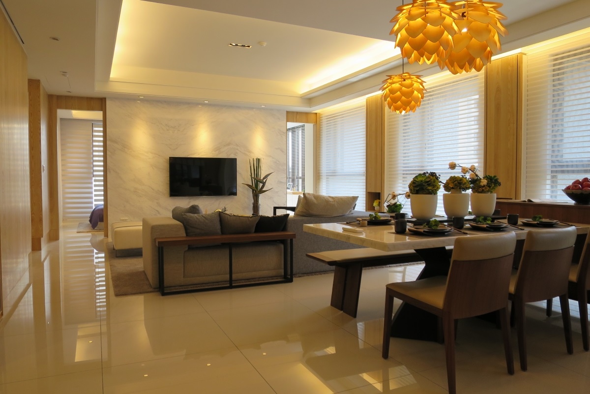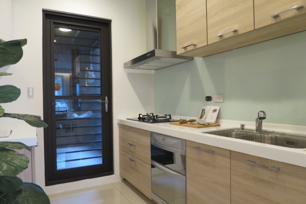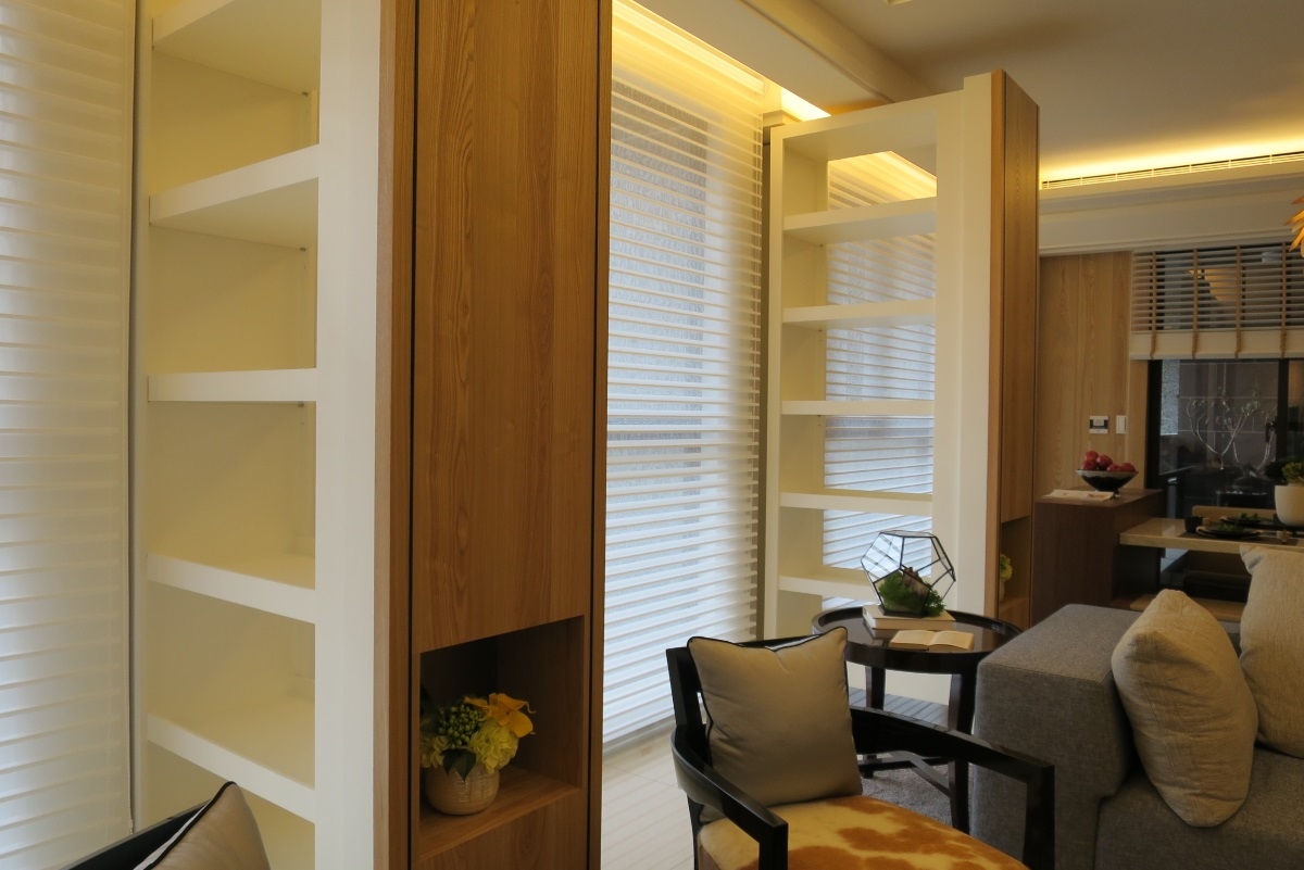 [住週短評]Life Park規劃有大面落地窗與雙陽台,無論採光或是通風都不錯。Life Park實品屋有別一般大坪數以深色為主調,是以木質、黃色系打造出溫馨的居住空間,且設有多處收納空間,比如柱體有可拉出的收納櫃體,在廚房外也加裝了移動門,阻擋油煙的同時也相當美觀。03-5781888