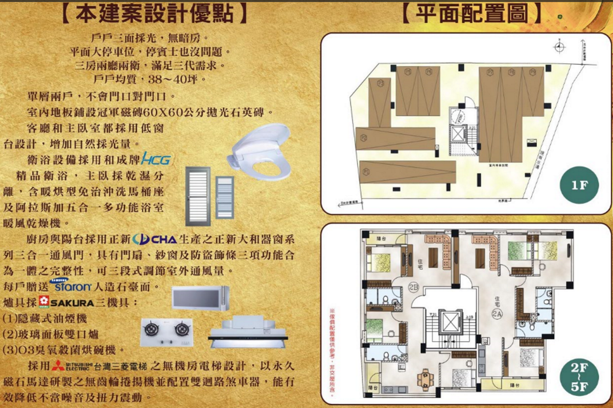 [建材設備]冠軍磁磚60x60cm拋光石英磚,和成HCG精品衛浴、主衛含暖烘型免治沖洗馬桶座及阿拉斯加五合一暖風機;櫻花廚具;銓盛氣密窗及正新大和器三合一通風門,配備8mm綠色強化玻璃。台灣三菱無機房電梯,New Elenessa系列,採用永久磁石馬達。[公設種類](略)