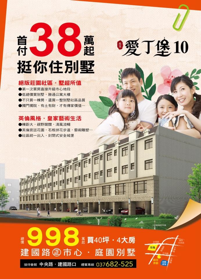 [住週短評]愛丁堡10基地座落頭份市建國路、信東路口,生活機能強,規劃面寬5米、1樓停車2車位RC連棟式透天社區。業者現祭出998萬起破盤價搶市。接待中心:頭份市中央路、建國路口。聯絡電話:037-682525。*更多資料後補*